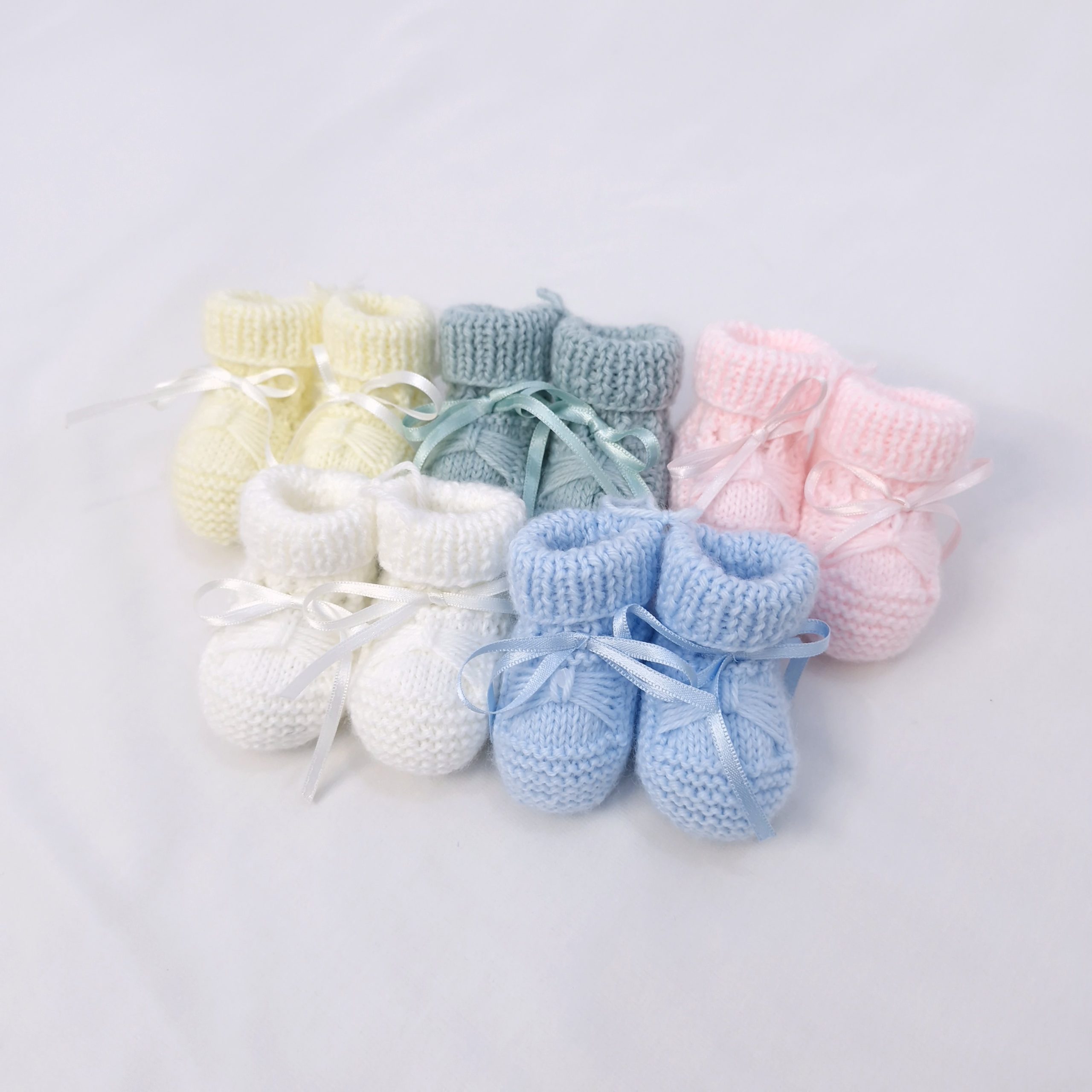Handmade booties. Available in Yellow, Blue, White, Mint and Pink