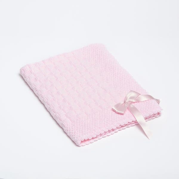 Hand-knitted Canastra blanket with pink ribbon detail.