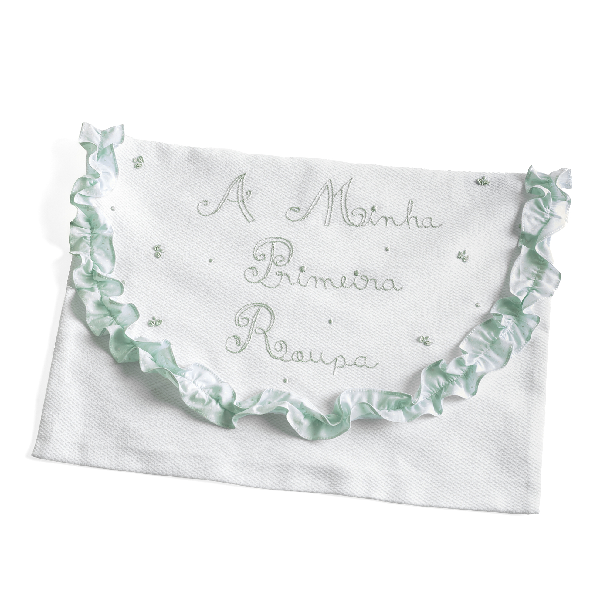 The “My First Outfit” bag, in 100% cotton white piqué with hand embroidery in mint green, was created to store your baby’s first outfit with care, safety and elegance. This item of the layette is not only functional, but also represents one of the most precious memories of motherhood, combining softness with sophistication.