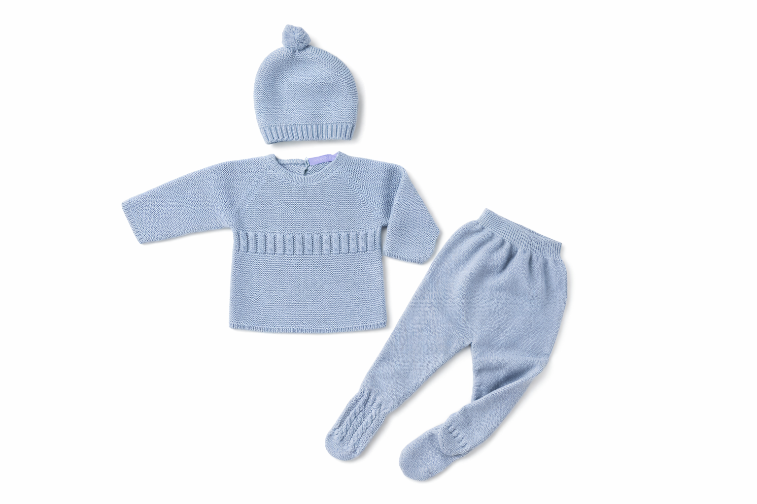 The Babychick set consists of a knitted romper, hat, booties, and matching blanket. It is carefully handcrafted, ensuring comfort, elegance, and a touch of tenderness in every detail.