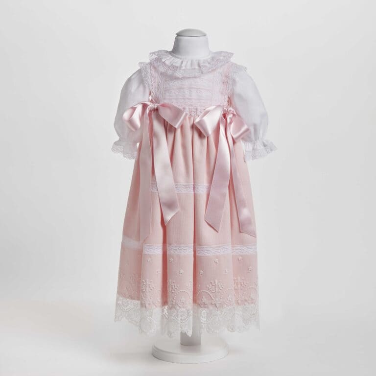 Diana Baby set in pink fustian, consisting of a lace bodice, with embroidered tulle details, lined with vaela and a linen shirt with lace details.