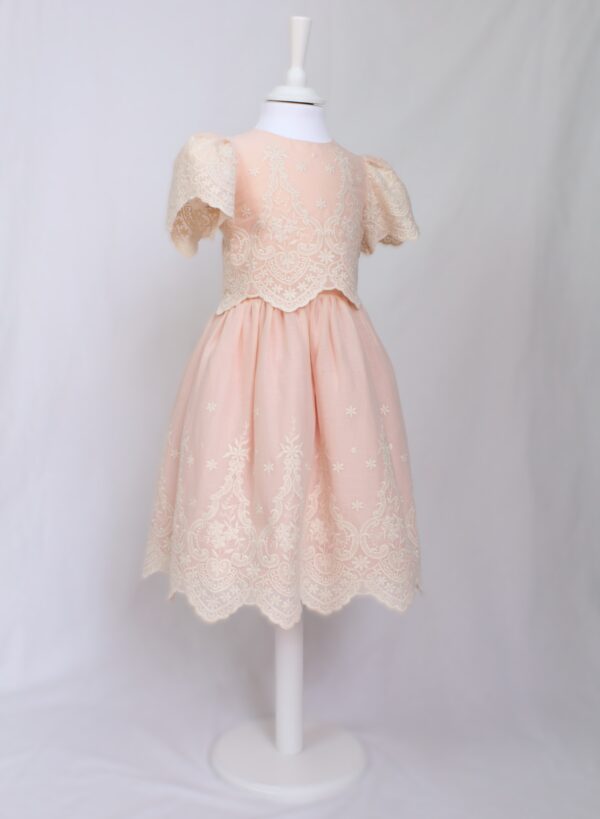 The dress features an impeccable cut that adapts to the child’s body, providing a feeling of softness and comfort throughout the event. The lightness of the fabric ensures that the girl feels comfortable throughout the day, allowing her to play and move with total freedom. The simplicity of the design is complemented by discreet details, which add a touch of sophistication without overloading the look.