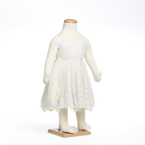 The artisans selected high-quality materials to create the “Cupélia” dress, ensuring elegance and comfort. The main fabric is 46% nylon, 27% cotton, and 27% polyester, providing a lightweight and sophisticated fit. The base is composed of 58% polyester and 42% acetate, ensuring structure and durability. Furthermore, the 100% polyester lining ensures a delicate and soft touch on baby’s sensitive skin, without compromising comfort during use.